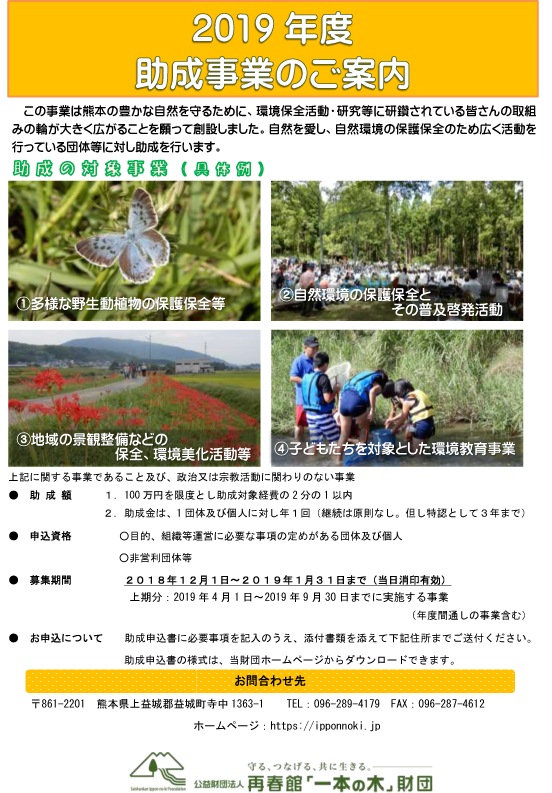2019年度上期分の助成事業を12月から2019年1月にかけて募集します。詳しくは財団ホームページをご覧ください。