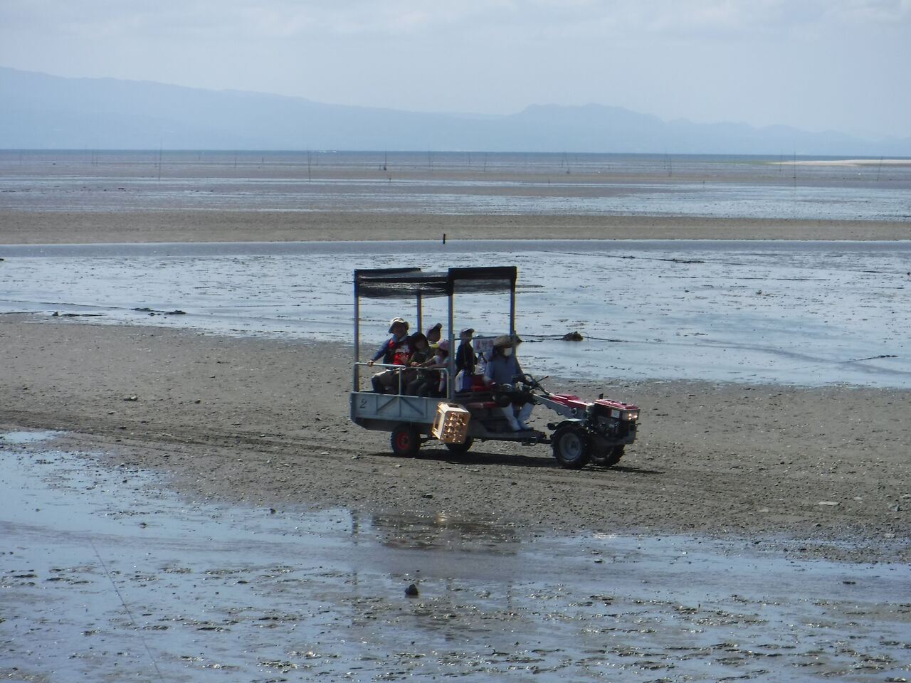 午後、子どもたちは耕うん機に荷台を付けた「テーラー」に乗って少し沖のほうへ。このあたりの干潟は柔らかくズボズボとはまって、思うように歩けません。生きものは暑さを避けるため深く潜っていてなかなか見つかりませんでした。