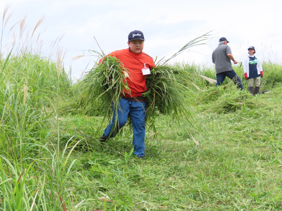 草を刈る人、運ぶ人。順番に交代しながらあっという間にトラックいっぱいになりました。