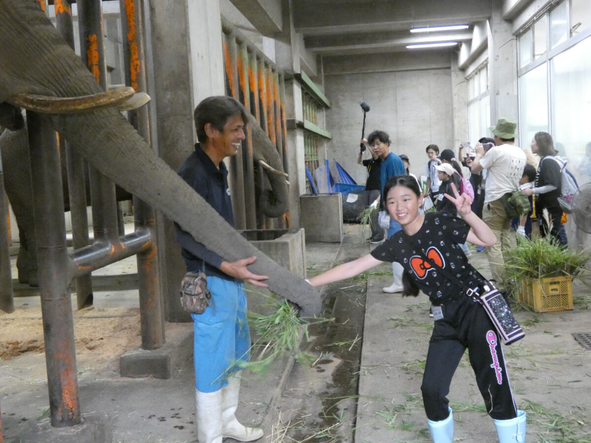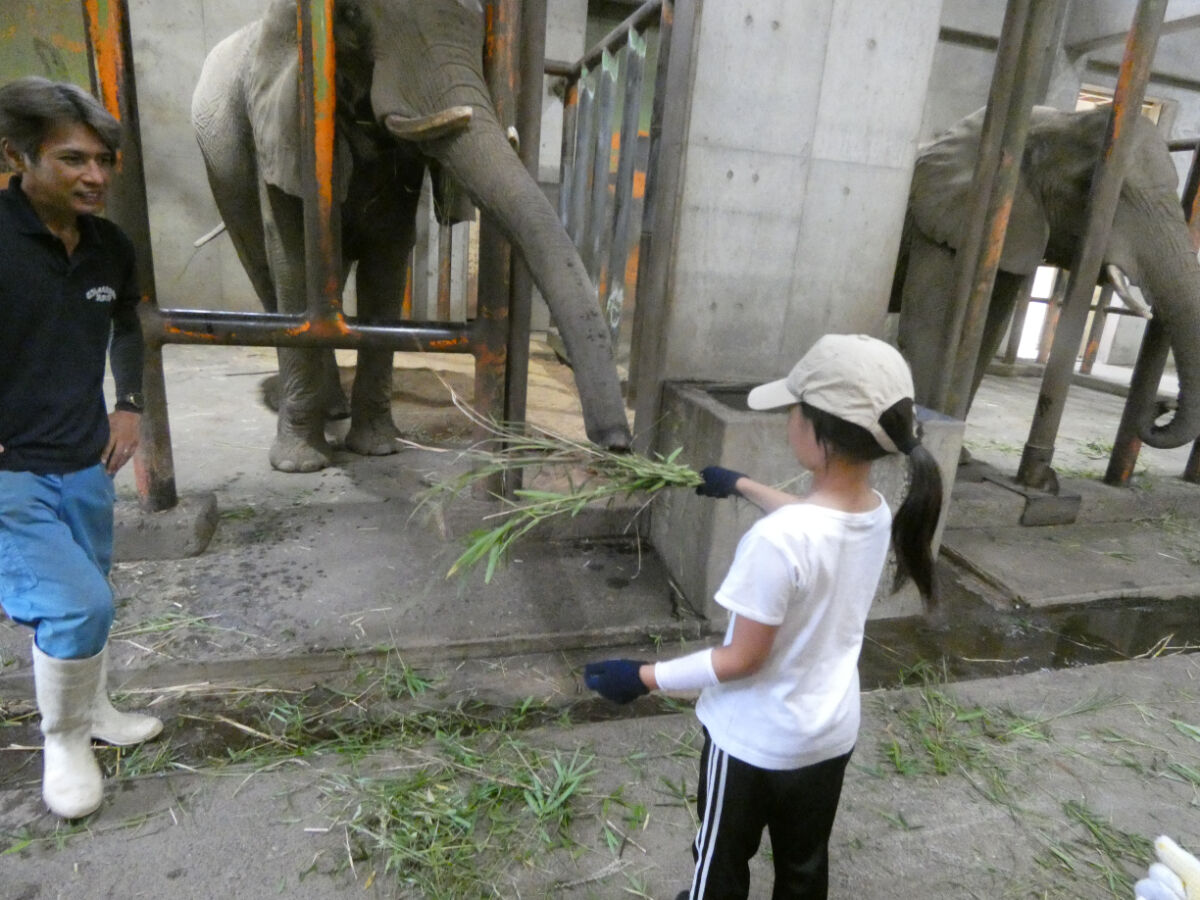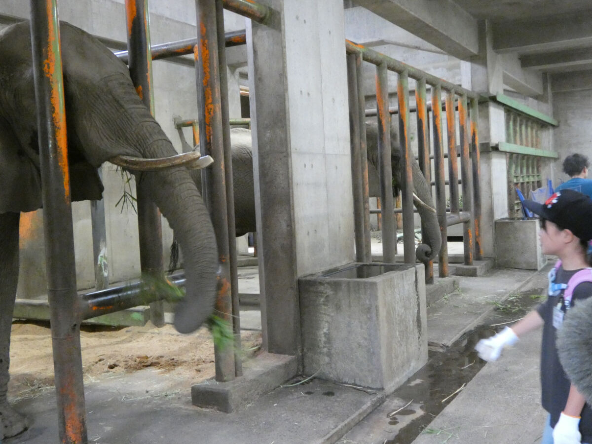 飼育員さんから、ゾウは一日100キロのエサを食べること、そのうち60キロが草で、他にニンジン・サツマイモ・ペレット・干し草のキューブなどを食べると伺いました。朝はミルク10ℓ、夕は味噌汁10ℓも飲むそうです。